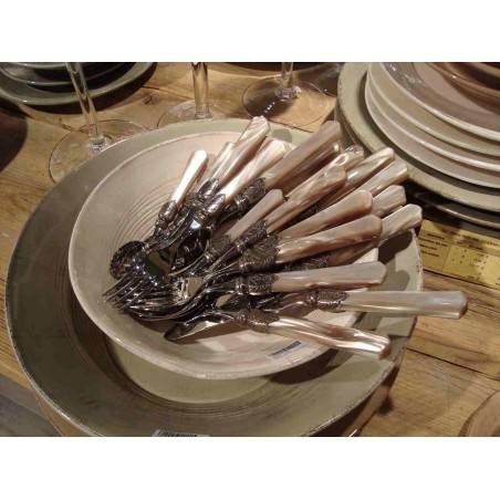 Estilo victoriano para la colección de cubiertos Rivadossi Vittoria. Homenaje a la etiqueta rígida de la época, al gusto de la precisión del ornamento y los tonos de color oscuro y luminoso que han caracterizado el período histórico. La ostentación de riqueza sobre la mesa se convierte hoy en día en una elegancia atemporal y rigurosa. Mango nacarado en PMMA con colores brillantes y anillo de estilo antiguo. 18/10 pulido de acero inoxidable, 2.50 mm de espesor. Apto para lavavajillas máximo 65 °. Hecho en Italia 100%.